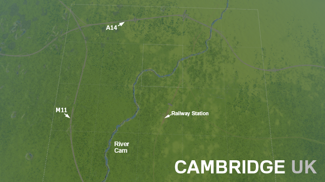 A simple map of the area around Cambridge in the UK.