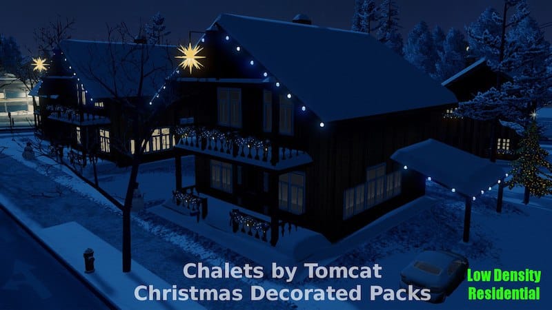 Residential Low – Levels 1-3 are vanilla houses, levels 4 and 5 are the Christmas-decorated Chalets *only*. That means that once a house reaches level 4, from then on it can only be a Christmas Chalet and so will the house that replaces it when it goes up to level 5.. One or two sizes, for example 1×1 lot, have no assigned building. A 1×1 spot of low residential will therefore remain empty