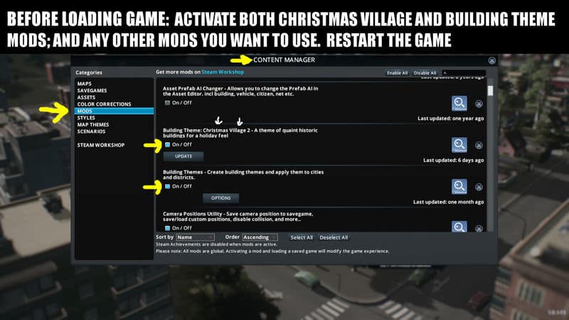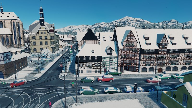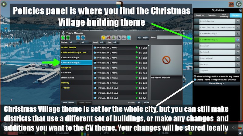 Requires the Building Themes by District Mod (updated for Green Cities – does not require DLC). You can subscribe in one click to all Christmas Village save game items, right above ^^ at the Christmas Village Collection.