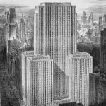 Chicago art deco towers are often shaped like “chairs”, as opposed to the “wedding cake” style of New York art deco. As such, this limestone hulk consists of a black marble base that gives way to four turrets at the corners enclosing the central tower. The two turrets at the rear are conjoined to form the “back” of the chair. Brass windowframes are recessed, cut into stiff ribbons to emphasize the building’s verticality.