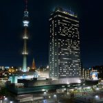 The Park Inn at Alexanderplatz is Berlin’s tallest building at 149.5 meters. Completed in 1970, it was originally the “Hotel Stadt Berlin,” part of the GDR “Interhotel” chain. After reunification, it was purchased by the Park Inn hotel chain, which was later acquired by Radisson in 2003. In 2005, the entire facade received a make-over, with the two 35m tall antennae being added in 2006. Today, visitors can leap off of the roof in Jochen Schweizer’s basejumping bungee experience. The sub-building features various restaurants, shopping outlets, and a car rental agency.