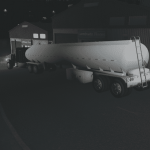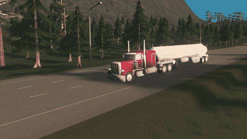 The truck is pulling a typical tank trailer that is used to hauling liquid fuel such as gasoline and diesel fuel in the US.