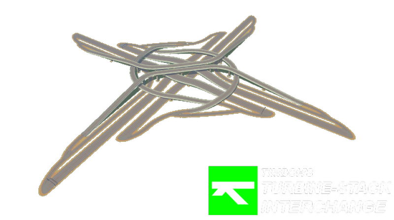 Allright, this interchange, then! This is a Turbine-Stack, and just like the name suggests, it’s a turbine… and a stack. It’s one of my favorite interchange designs actually, and it’s a bit of a pity that it’s quite rare. The way its constructed gives two directions faster stack ramps, and the other two gets turbine ramps. Like I said, the stack ramps ae faster, but the differnce between the stack and turbine ramps are so small, the entire interchange peforms very well overall, putting it at second place between the Stack and Turbine. Furthermore, two quadrants are next to empty, which gives you alot more room for more of those beautiful new airports (thanks Colossal! *whink whink*)