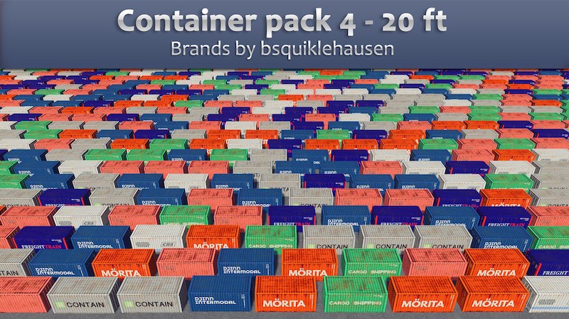 A pack of 20 ft containers with all your favorite brands by bsquiklehausen. Visit his workshop for freight trains and props matching these containers.