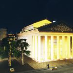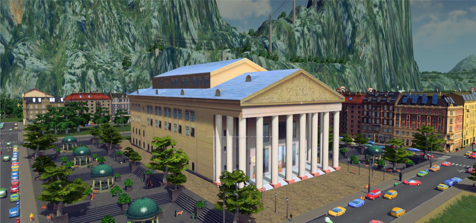 Единственный полностью реализованный градостроительный ансамбль центра Кемерова был воплощен на театральной площади. Проект драматического театра на 800 мест в Кемерово (пр. Советский, 53) разрабатывался в 1953-57 гг. проектным институтом «Гипротеатр» (г. Москва). Автор проекта – архитектор А. П. Максимов.