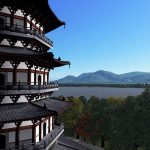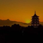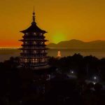 one of the Ten Scenes of West Lake (“Leifeng Pagoda in the Sunset”). The original was built in 975 AD, during Five Dynasties and Ten Kingdoms period, at the order of King Qian Chu (born Qian Hongchu) of Wuyue, to celebrate the birth of Qian Chu’s son, born to Huang Fei. During the Ming dynasty, Japanese pirates attacked Hangzhou and burned its wooden elements, leaving only the brick skeleton. Later, due to a superstition that the bricks from the tower could repel illness or prevent miscarriage, many people stole bricks from the tower to grind into powder. The pagoda finally collapsed in 1924 and the new pagoda we see today was rebuilt in 2002 on top of the ruins of the old one. The base of the pagoda become an exhibition room of the old pagoda’s ruin. (from: wikipedia [en.wikipedia.org])
