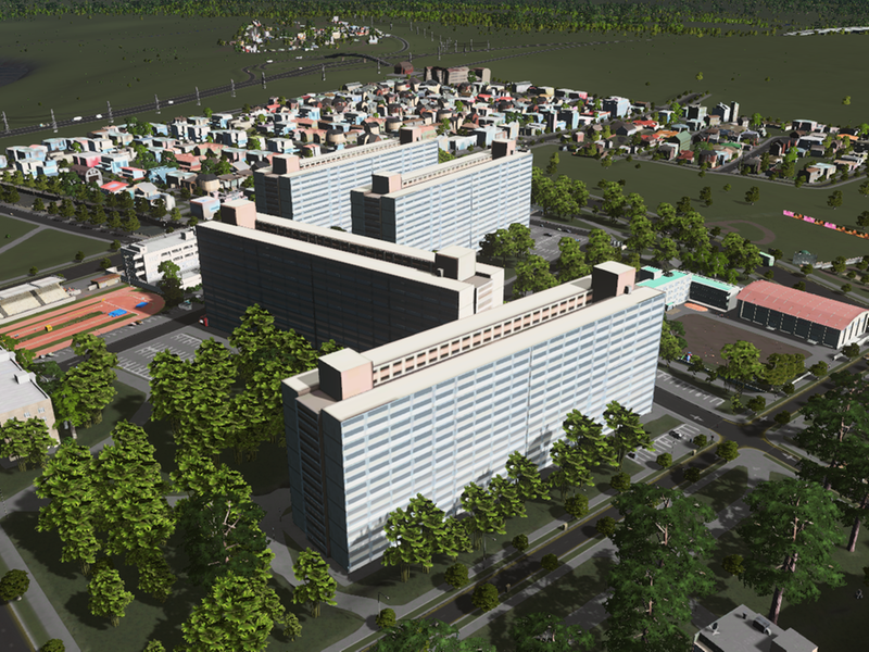300 rooms, quality is 3 stars, with 70 worker slots. The design is based upon a standard 1970’s Japanese public housing design, built in various but similar configurations (some textures are from Toshima housing estate), with a long light-well in the centre of two slab sections with atrium-facing deck-access.