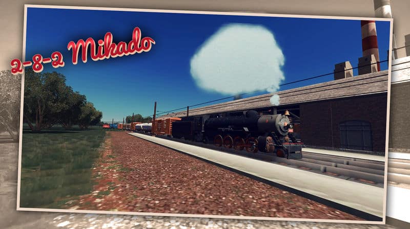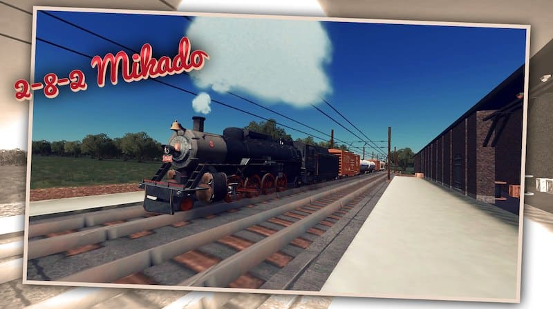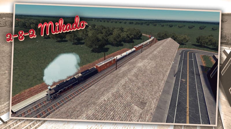 Its the 2-8-2 Mikado steam train, one of the most renown american steam trains, this train performed well in all fields of transport. Cargo ? no problem. passengers ? no problem either. This Mikado is used for specific transport from farms and rural stations. comes with a few boxcars, as well as grain hoppers and milk tanker wagons.