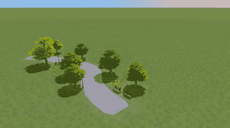 A simple walkway with some trees, flowers and benches. The flowers are a custom asste, for which credit belongs tio the original author. It should look OK even without the flowers, if you don’t want them.