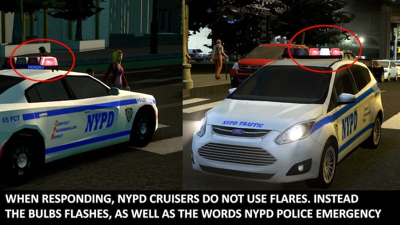 All NYPD vehicles carry no flares. Lights DO flash during emergency responses, as explained in the second photo. However, the in game flares do not work well with rotating lights, so I buried the flares deep into the ground. This is NOT a bug.