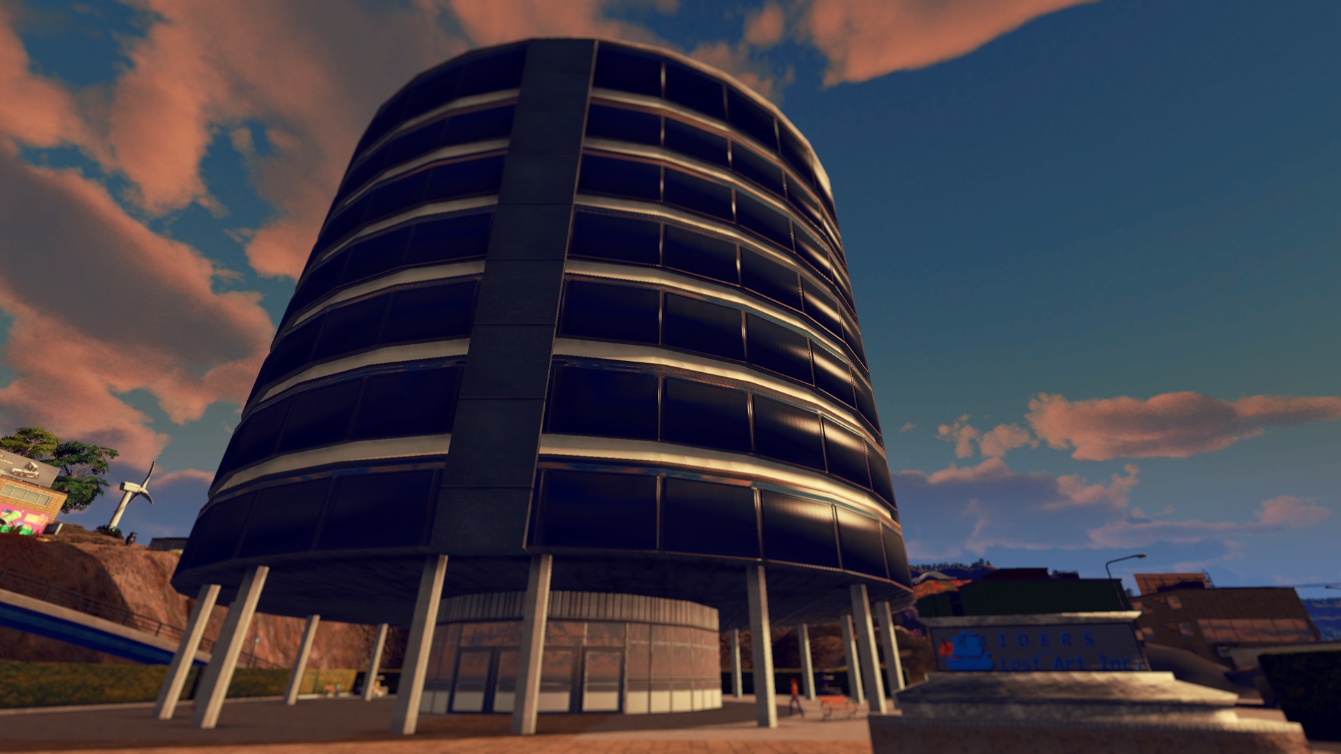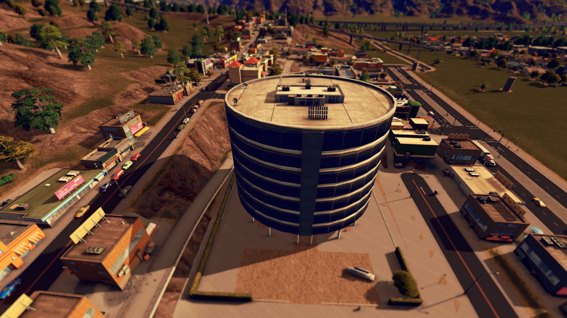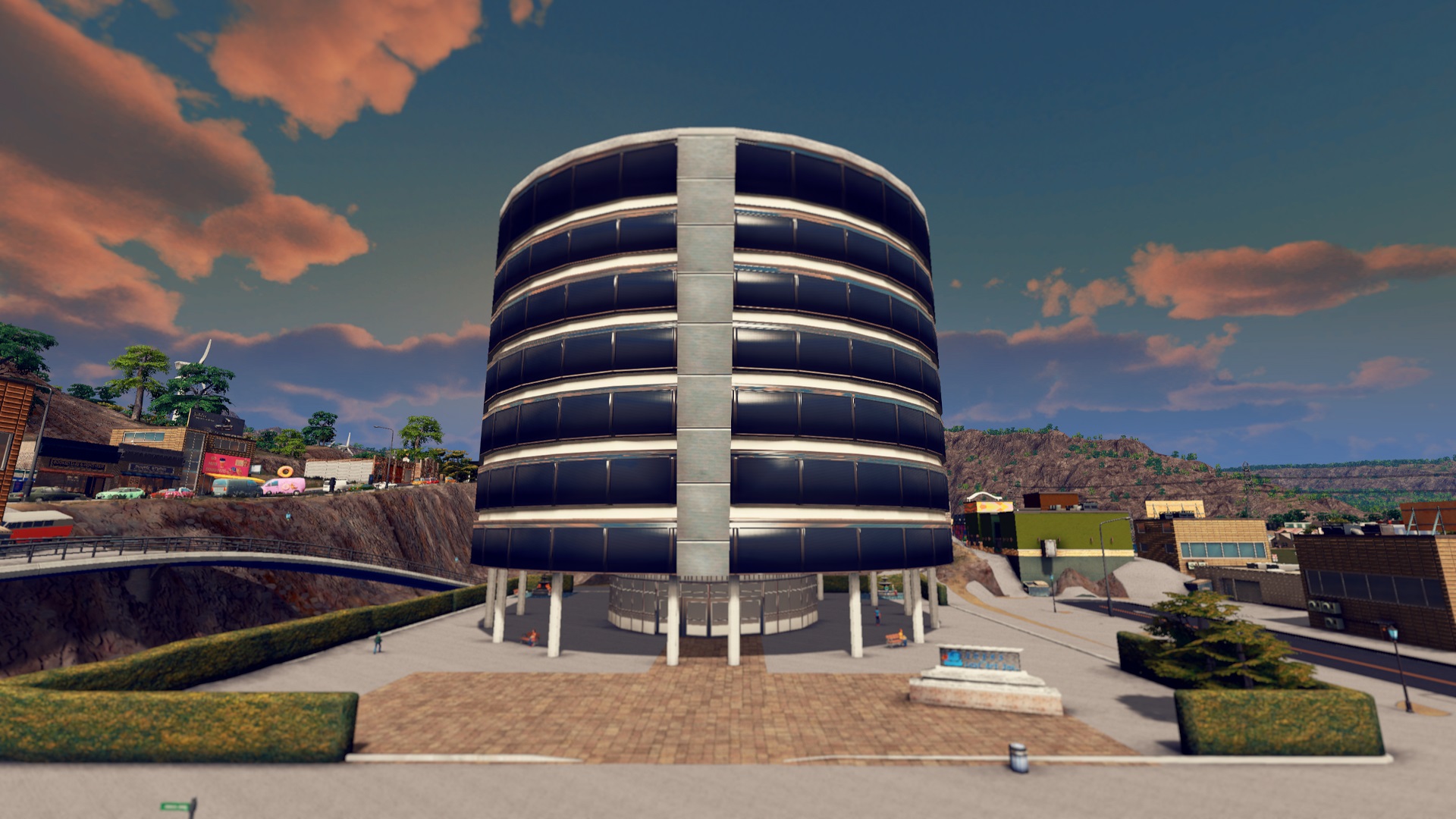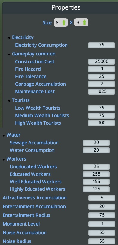 Here in a circular building – a 8×9 plot (fully ploppable, but connect to road to avoid issues with city services) – they can see it all. Found in the UNIQUE BUILDING tab – this building is a level 1. See the pictures for the ASSET PROPERTIES and more information on those stats. Suggestions on how to make this more balanced are always welcomed.