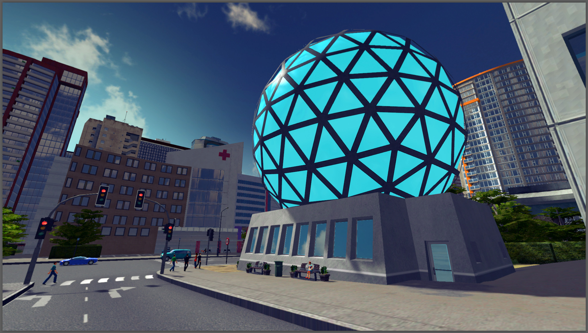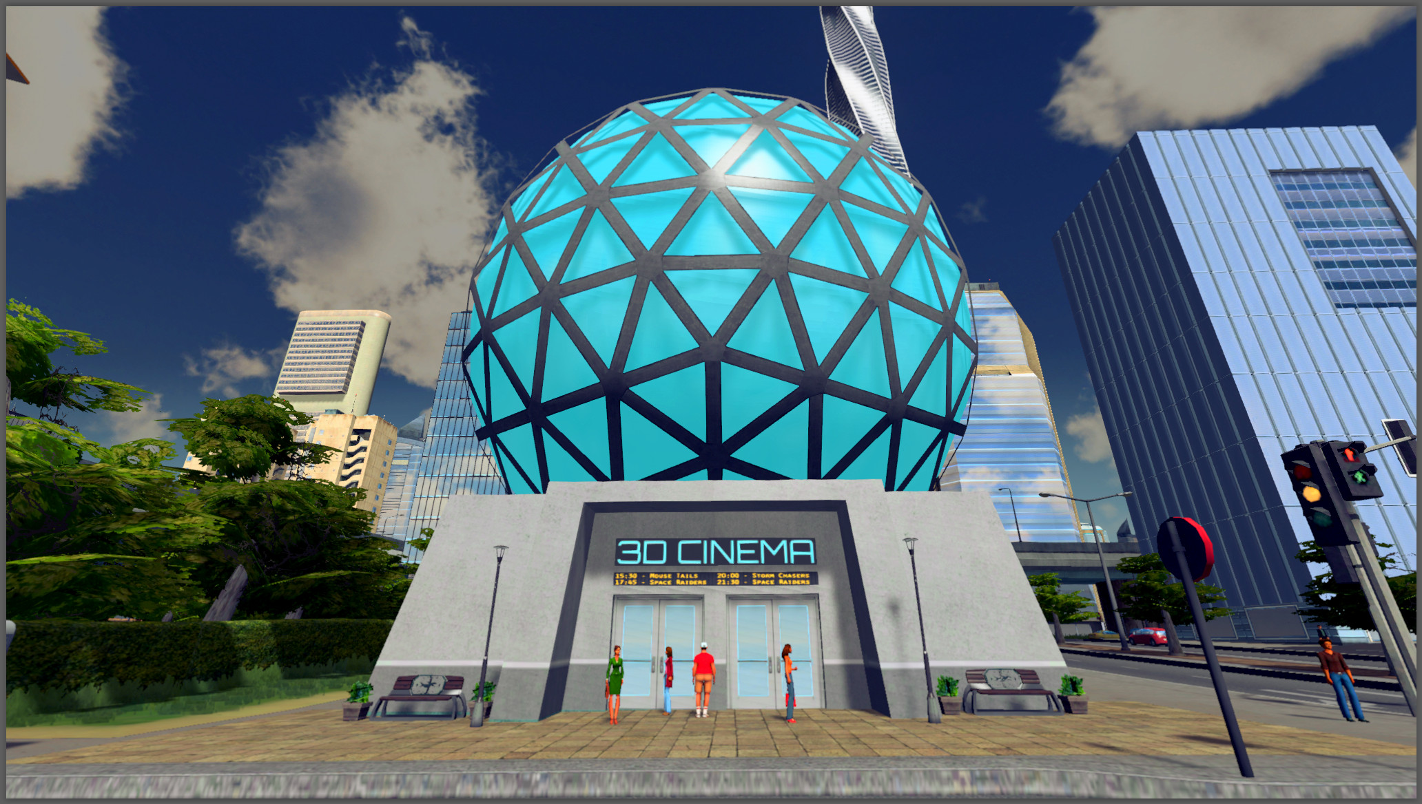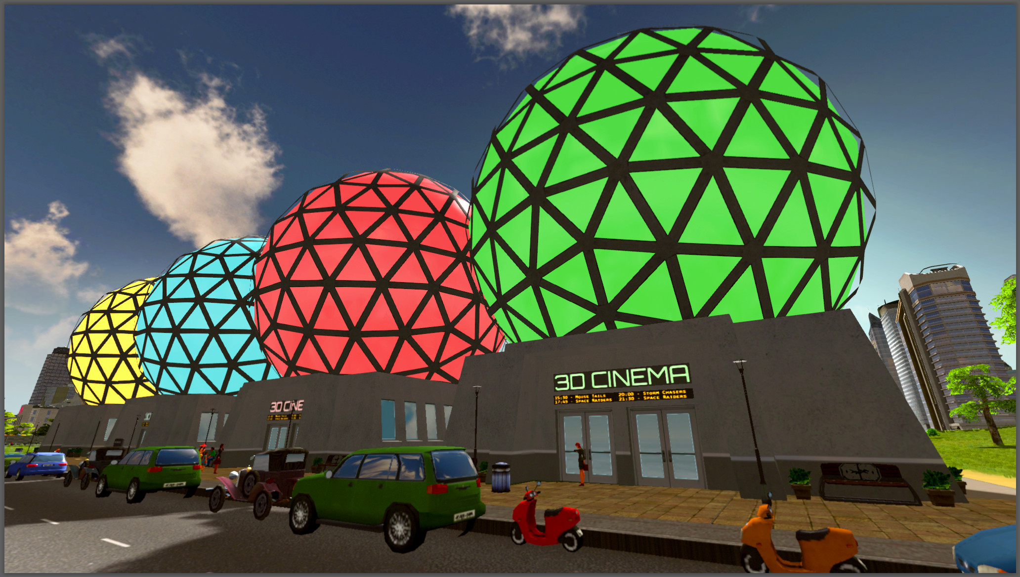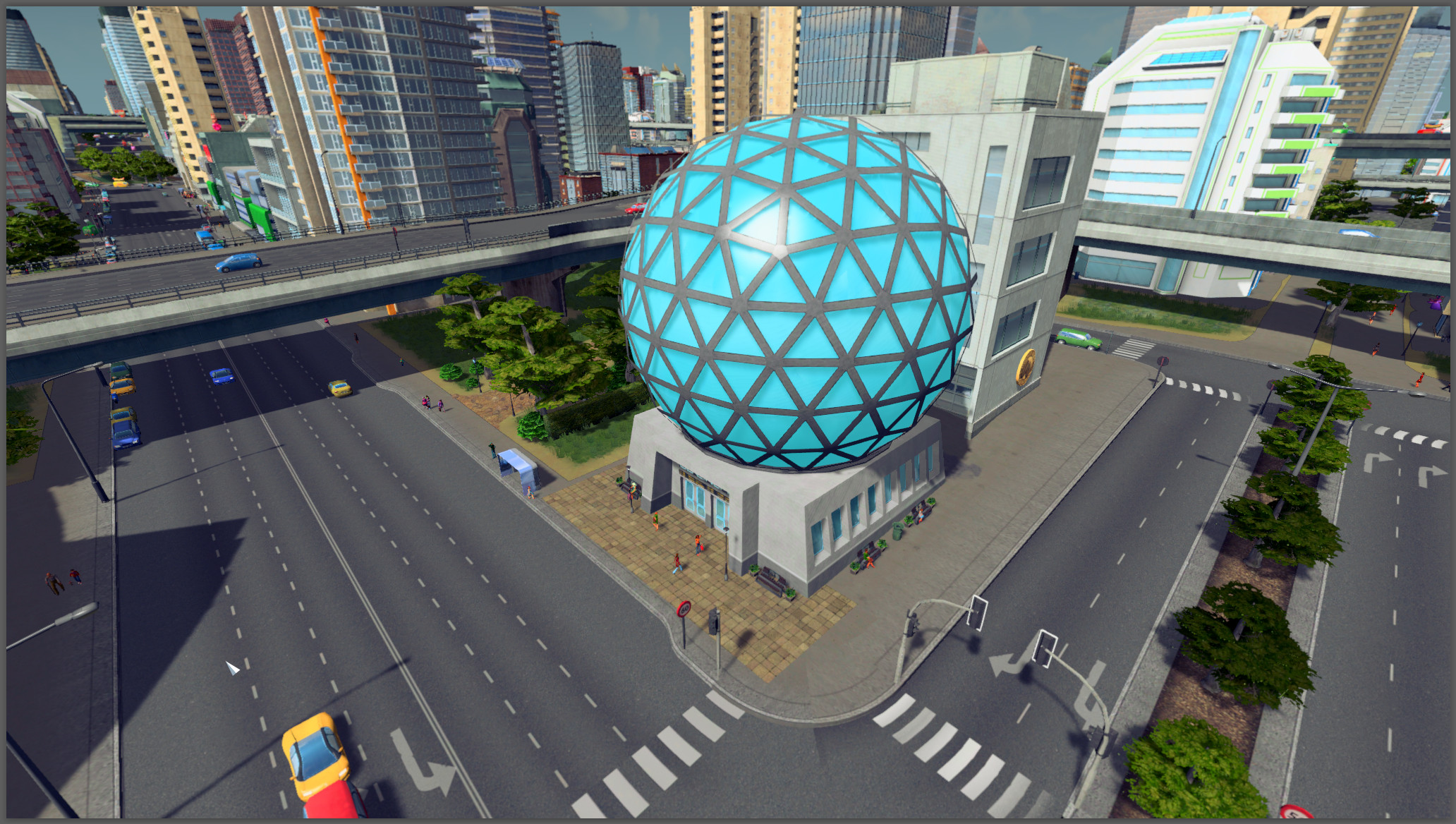 A recreation of the iconic 3D Cinema featured in RollerCoaster Tycoon (1999) and its sequel. The theaters main dome consists of more than 280 triangular faces locked into a geodesic pattern. Who doesn’t want a bright glowing orb in their city?