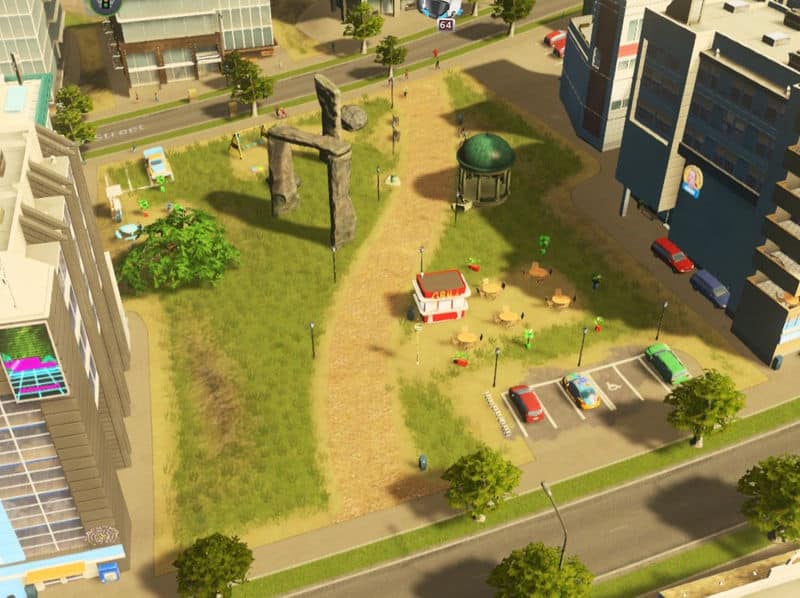 A small park 4×8 tiles big with playground, parking places and a path leading through, citizens can enter/leave on both ends.