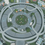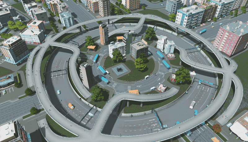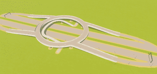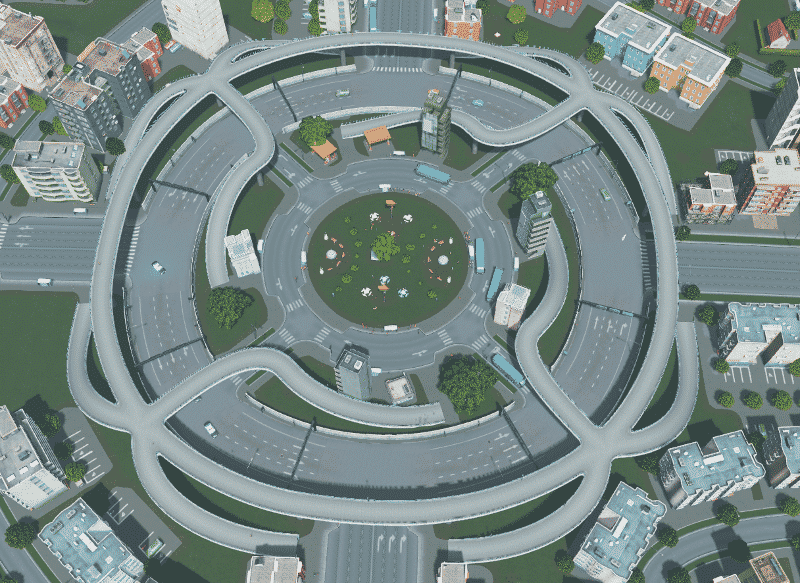 Built for moderate traffic. If you happen to have much traffic I recommend to change the middle roundabout into a one way that goes opposite direction compared to the outer roundabout, to prevent too much traffic on the bus lanes.