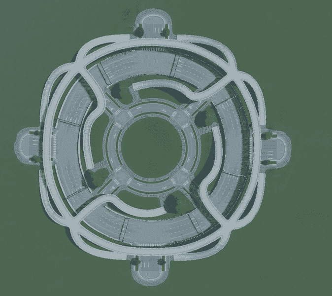 At the same time it offers a high way styled roundabout (to prevent pedestrians crossing the street on ground level)