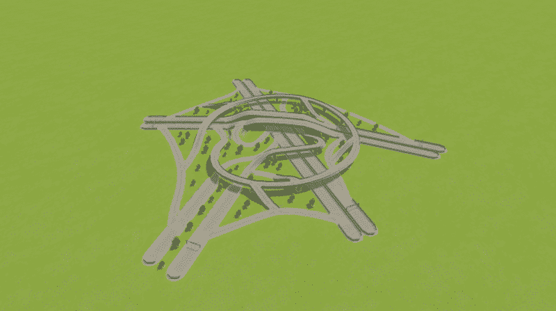 Eu o mudei um pouco para caber no Editor de Assets. Então algumas curvas estão bem acentuadas. Desculpe-me por isso, espero que eu possa corrigir mais tarde. Também utilizei o mod “No Pillars”, então caso queira ver o trevo perfeitamente, eu recomendo usar o mod. Para aqueles que não querem instalá-lo, tentei usá-lo o menos possível enquanto fazia o trevo. A única parte que vai atrapalhar, são os pilares que sustentam a ponte que passa por cima da rodovia “principal”. Estes pilares não alteram em nada, apenas um estorvo estético. A rodovia ainda funciona perfeitamente mesmo com o pilar “bloqueando” o caminho.