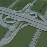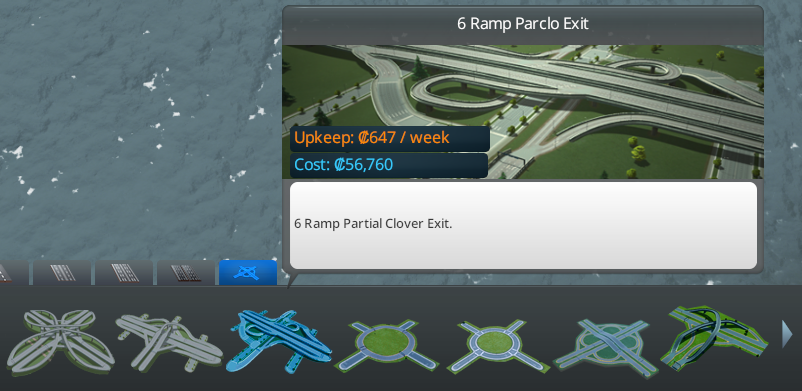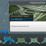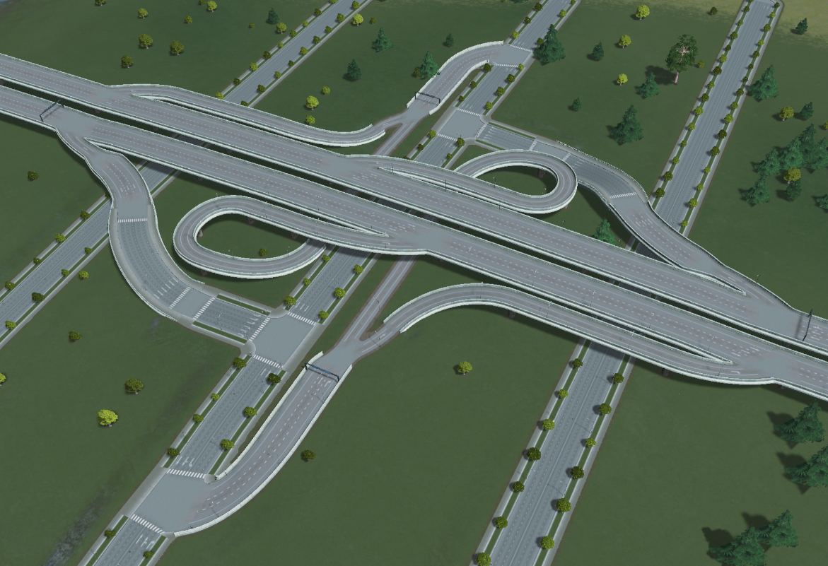 This is why the onramp highway sections start so far out; if you bring them in a little, drivers start preferring the entrance on the left side of the road over the clover. The offramp is six lanes for similar reason. Drivers won’t use the leftmost lane when turning right, because that lane turns into the onramp (not that anyone turns left). Ah well. Things to think about adjusting if you’re using a traffic mod.