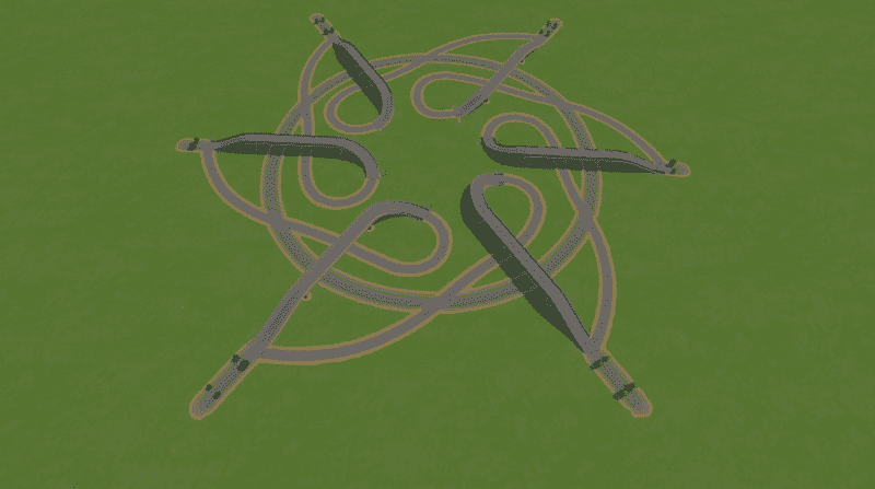 This vortex roundabout connects six roads using loop ramps. It features exits connected to the inner-most lane, forcing traffic further inside the roundabout. There is space to upgrade the circle to a six-lane, one-way road, however that creates traffic lights. It has good traffic flow but it is large and sensitive to slopes when plopping it.