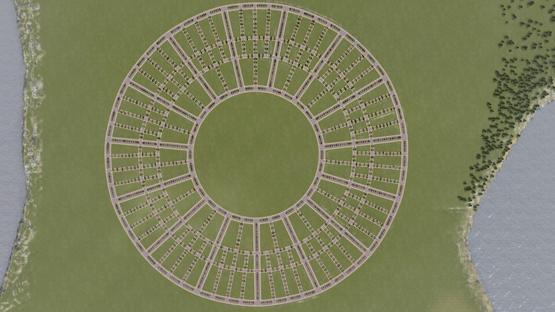 Zone de construction arrondi 24° pour relier d’autre parcelle ou pour faire un cercle géant. Il faut quinze segments pour faire un cercle complet