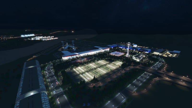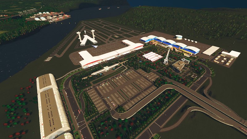 Airport: A huge (working) international airport with three runways, two airport buildings, a large bus terminal, a train station, some parking lots, a mall and some activities for long waiting periods.