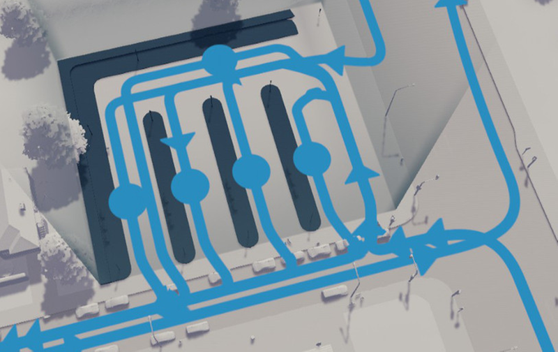 You can add infinite lines to each of the five stops but it’s not reliable to let the bus lane re-enter the building immediately after leaving.
