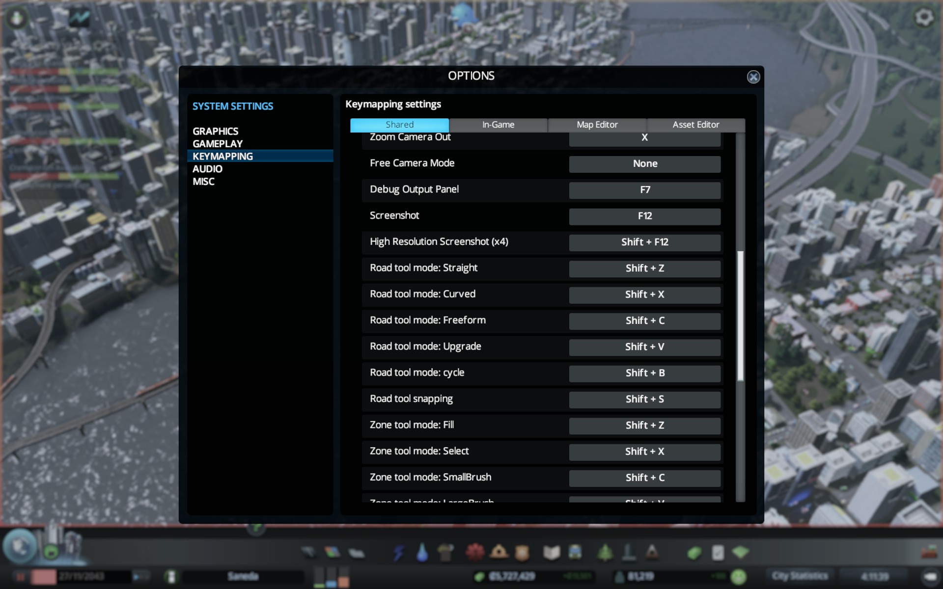 – Select zoning tool mode (fill, mark, small brush, large brush). (shortcuts can overlap with road tool mode)