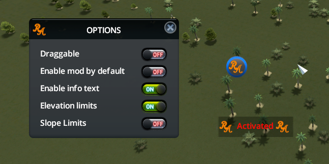 Set Elevations Limits to “on” for increase limit of road, rail track and pedestrian between -120m and 255m even if the mod is not activated
