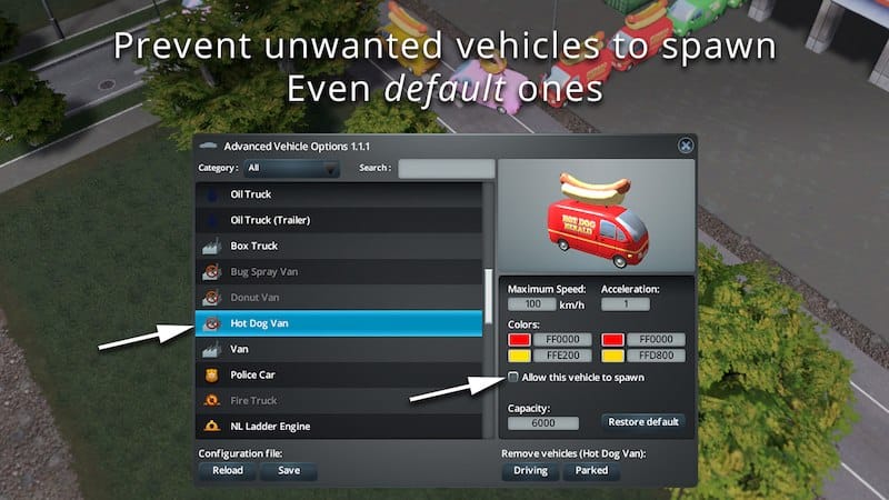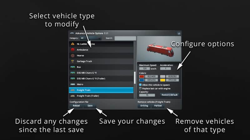 Capacity: Lets you change the capacity of the vehicle. Note: bigger cargo/garbage capacity is not necessarily better. Cargo/Garbage collection needs to be dispatched across the map so the more vehicles you have the better, as long as the road network can handle the load. You don’t want the capacity too low either as it will generate a lot more vehicles. Try to stay close to default vehicle values.