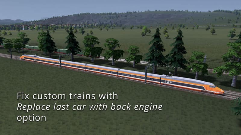 Replace last car with engine: Allows you to make the last car of a train be an engine. The engine is automatically reversed. Now automatically applied to existing trains.