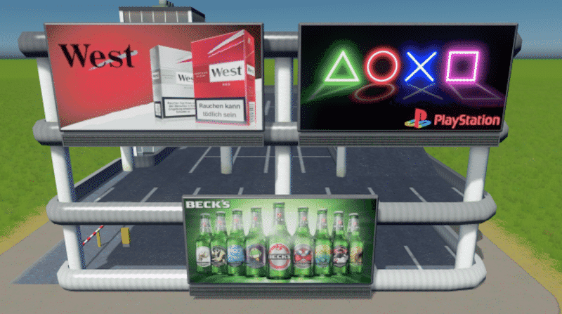 In the pictures the billboard is presented on Kliekies parking garage, which has a footprint of 4×4, so you can estimate its size. The billboard is still a little bit bigger than some of the vanilla-games big billboards, but it’s only 60% the size of my (GCVos’) big ones, so i chose the medium-tab.