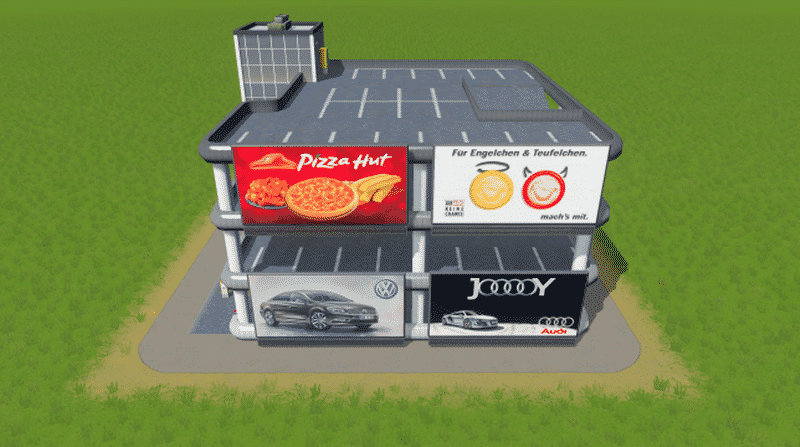 In the pictures the billboard is presented on Kliekies parking garage, which has a footprint of 4×4, so you can estimate its size. The billboard is still a little bit bigger than some of the vanilla-games big billboards, but it’s only 60% the size of my (GCVos’) big ones, so i chose the medium-tab.