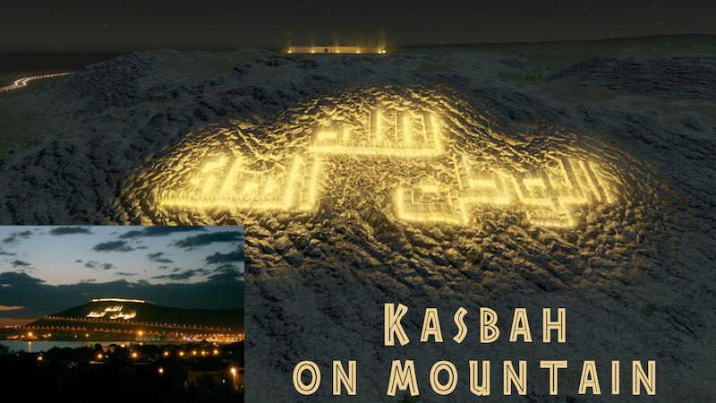 * Casbah and Words on Mountain – The Agadir Oufella is on top of the hill overlooking the city. The hill bears the inscription in Arabic: “God, Country, King” which, like the walls, is in real life illuminated at night.