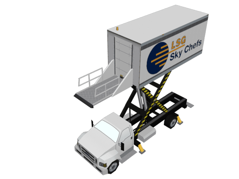 An Airport catering truck. This variant is in the servicing position for tall aircraft (specifically the 767 / 747 family). This model contains 700 Tris and a 512×512 texture, and has a LOD model with 120 Tris and a 32×32 texture. A note about the preview image: the preview image is from a version with a 256×256 texture, which has since been updated.