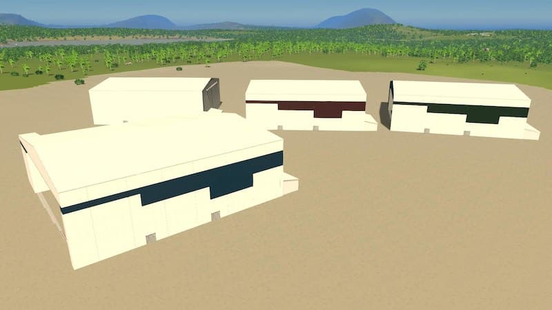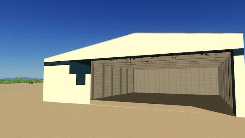 This hangar only has 4 doors, which open from the left side. All of the doors are the same size, the only difference is the color pattern on the two center doors (see images). These can be configured in any way you like, however. To place them, I recommend placing them in the closed position (using the track texture on the ground to help with placement). Once placed, they can then be moved using MoveIt in an open position to however far you wish (keep in mind: just because there is a large aircraft inside, the door does not have to be all the way open).