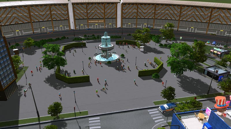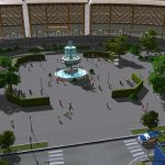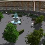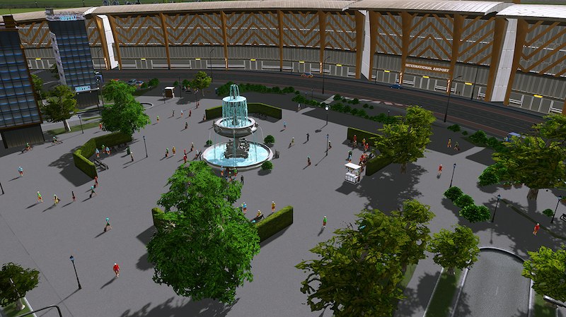 This round empty space at the airport is as ugly as dangerous: who wants to have a huge skyscraper or dirty industry where planes land and passengers arrive? The Airport Plaza is based on the huge fountain and fills that void.