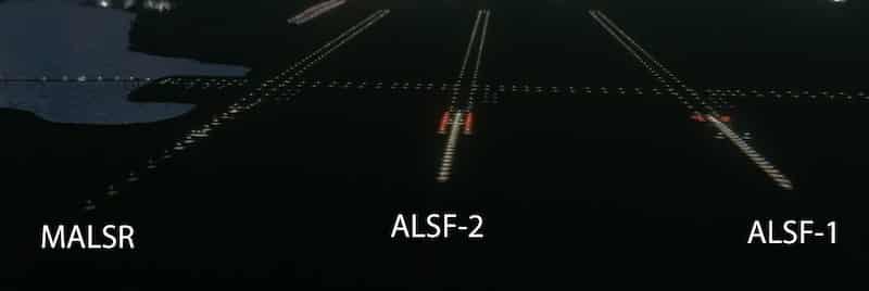 The uploaded image shows three common configurations of approach lights used by airports. Most large airports will use ALSF-2, however, if there are space constraints (due to a city being in proximity), something simpler such as MALSR will be used.