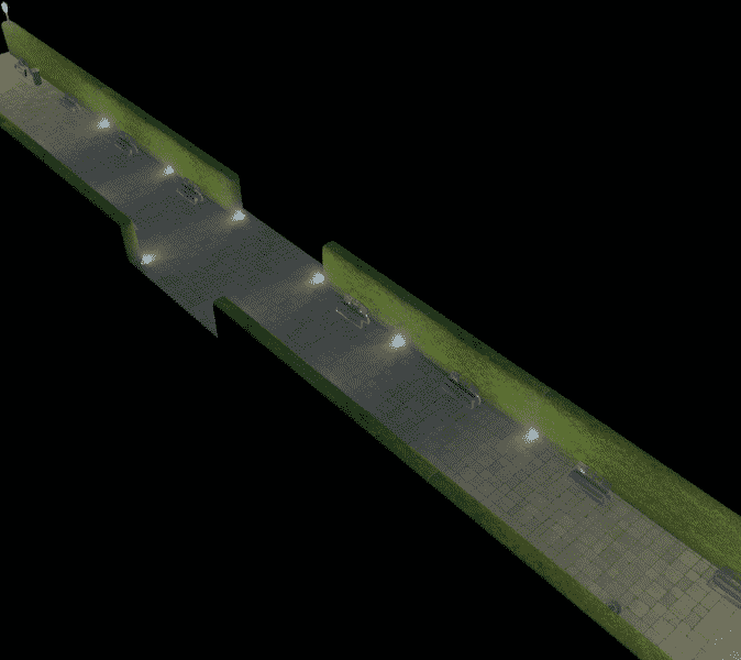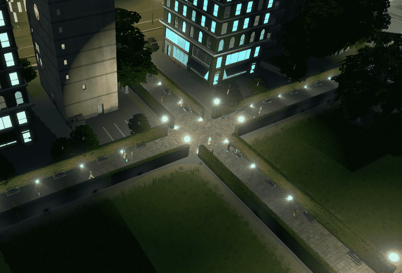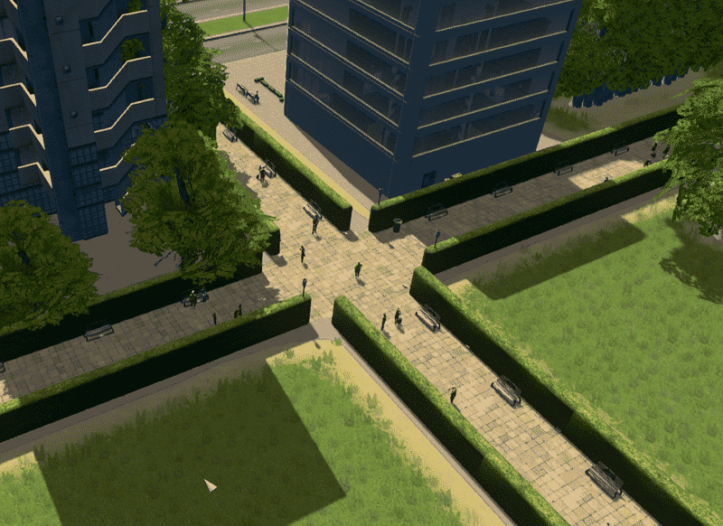 Cross 9 tile zones with this is a specially designed park which allows pedestrians to cross from street to street through zones with ease. Also provides a place to relax in a beautiful park built by request of alesmith.
