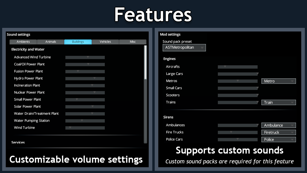 - Various sounds from buildings, like Commercial, Industrial, various power plants, various stations, buildings that are on fire, and more