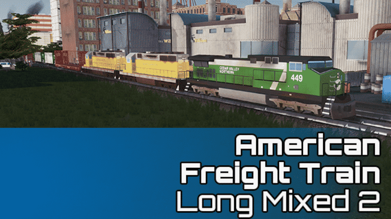 A very long mixed train. Looks great snaking through industrial areas of your city! Its length may cause odd behaviors with stock C:S cargo stations – check out my Short variants of the American Freight Train on my Workshop page.