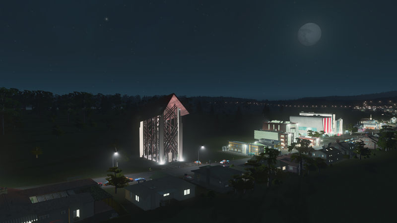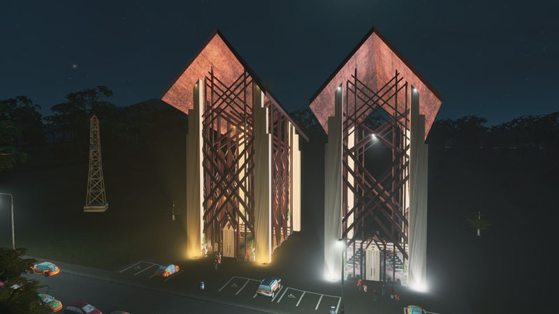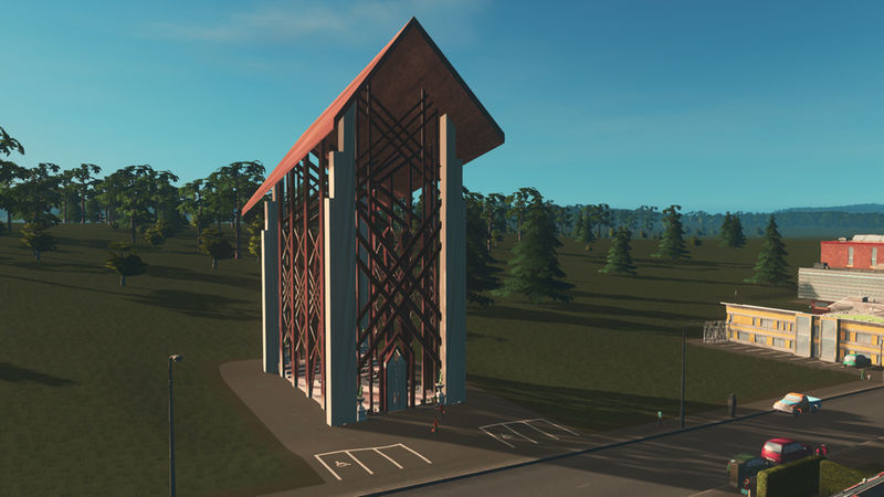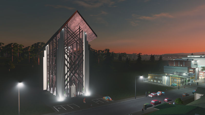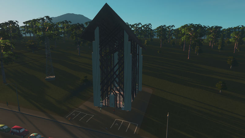 This building is based off a chapel called Anthony Chapel. It’s nestled in a woodland garden and a very popular wedding area. The building is almost entirely made of glass, that is also so clear it seems like it isn’t there. I made the design choice not to put windows on the model, because you aren’t able to have transparency in CS ? I would of loved to have a little bit of reflective, but this will have to do. I added pews and a podium inside for this reason. The cims will go in and sit on these, too.