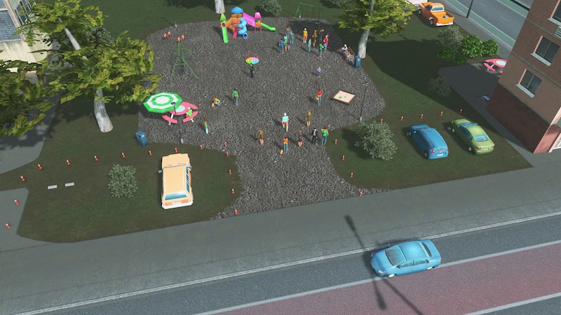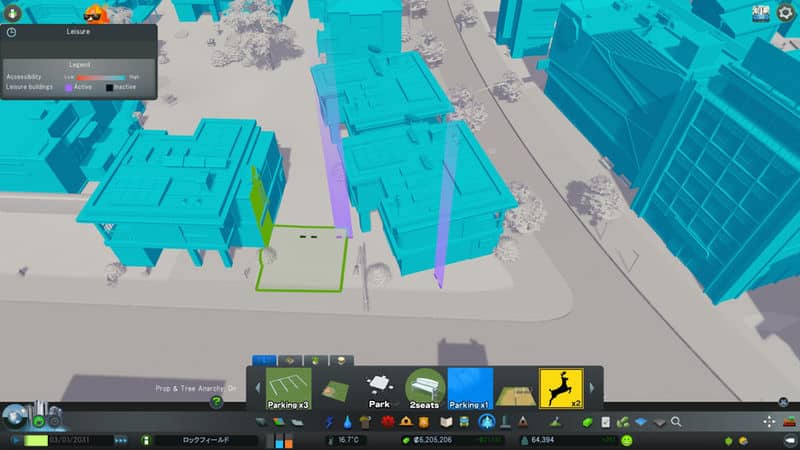 - 観光客訪問数を0にしてあるので「道路に接続されていません」アイコンは出ません。なお住民は公園としてここを訪れませんが、駐車はしに来ます。