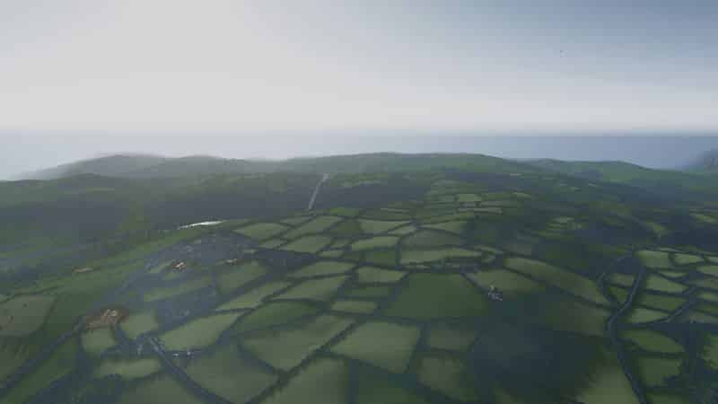 A haphazard patchwork of fields and farms spans the countryside amongst the grassy moors. Rivers break through the hills to reach in from the sea. Through it all cut the arteries of civilisation; a motorway slicing through the woodland, joined in the middle by a second.