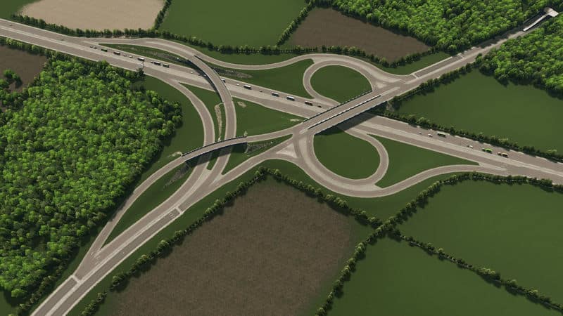 This intersection is suitable for medium-heavy traffic coming off of and going on to the motorway.