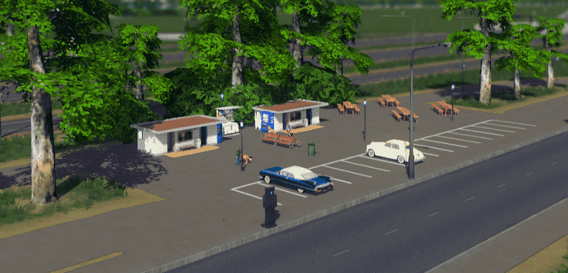 You can use this anyplace, but makes Highway Rest Areas active and interesting as Cims pull off the highway or freeway to rest… not to mention gives thes off ramps to a blank area a purpose.