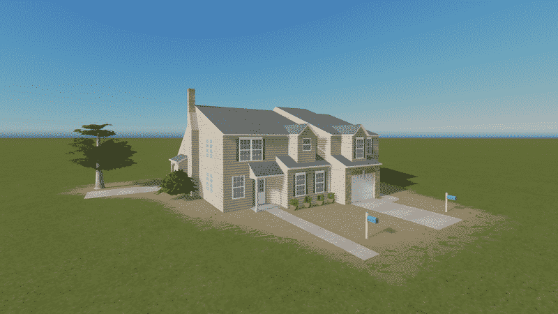 American style semi detached houses based on homes in Atlanta. These are basic homes that will pretty much fit in any type of surroundings.