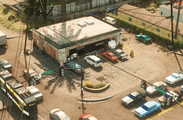 Azteca Mini Market is located in Saguaro Heights, a neighborhood in the chunk of my project inspired by East LA, thus taking on those design cues. The intersection it sits on borders the corner of a neighboring commercial area and is in the presence of two large interchanges, so traffic is a little busier on the surrounding avenues. You can now borrow it for your city, although it fits best in something west coast or southwest based.
