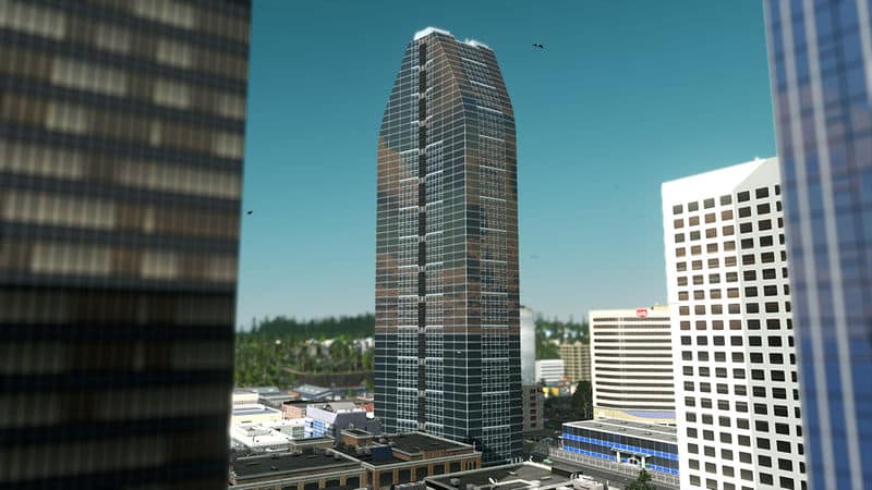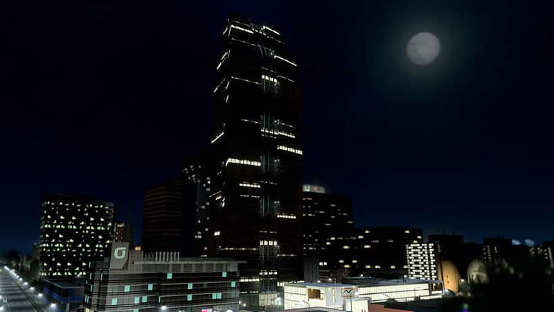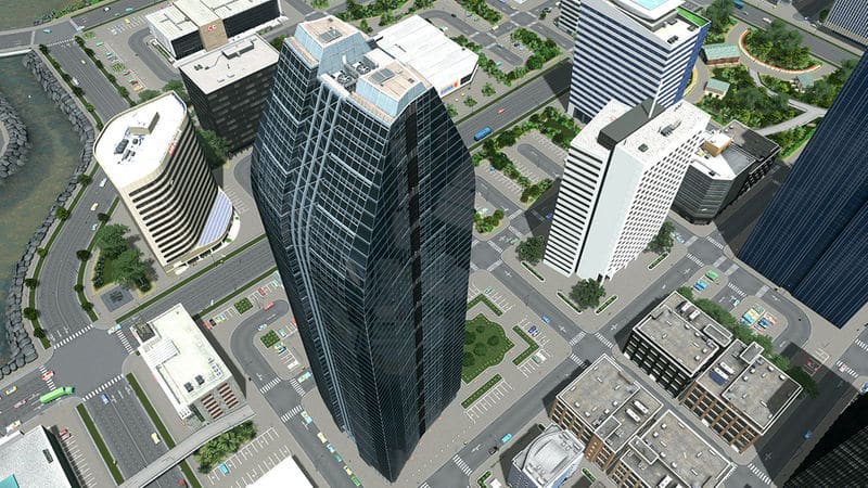 During the construction I calculated the floor area and I got out ~87.854 m² (area of elevators not included). According to a short research of ordinary skyscraper office buildings with an average floor area of 50.000 m², most of them offer at least 1.600 work places. Even more. Considering the Cities Skylines gameplay I finally set the count of employees to 420.