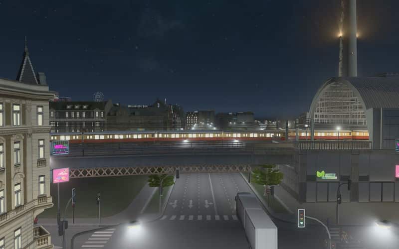 With illumation map and headlights for after dark. Driver cabin stays dark. The line indication panel changes color according to the train’s line.