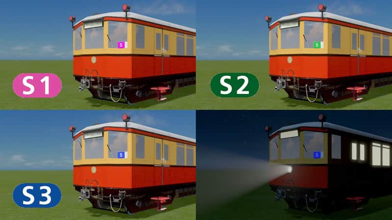 With illumation map and headlights for after dark. Driver cabin stays dark. The line indication panel changes color according to the train’s line.