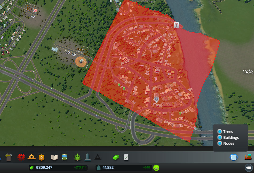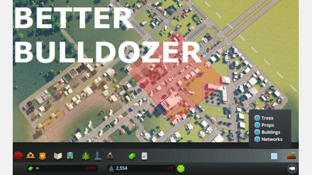 A Marquee bulldozer tool. As usual use at your own risk. Choosing “Nodes” will remove roads, electricity, railroads, water pipes metro tunnels. Also it’s possible to remove buildings that cannot be removed normally. Roads will need multiple passes to remove all of them.